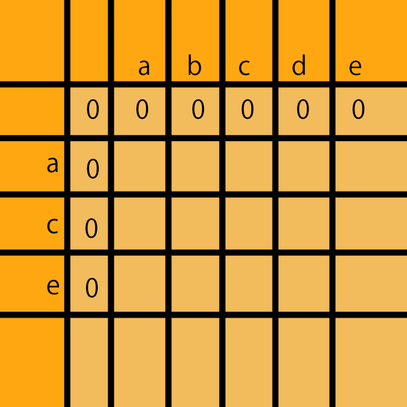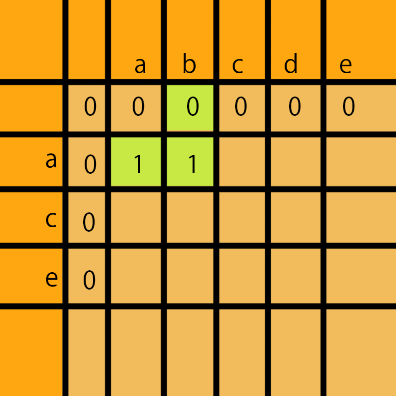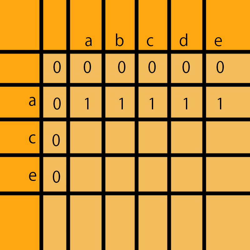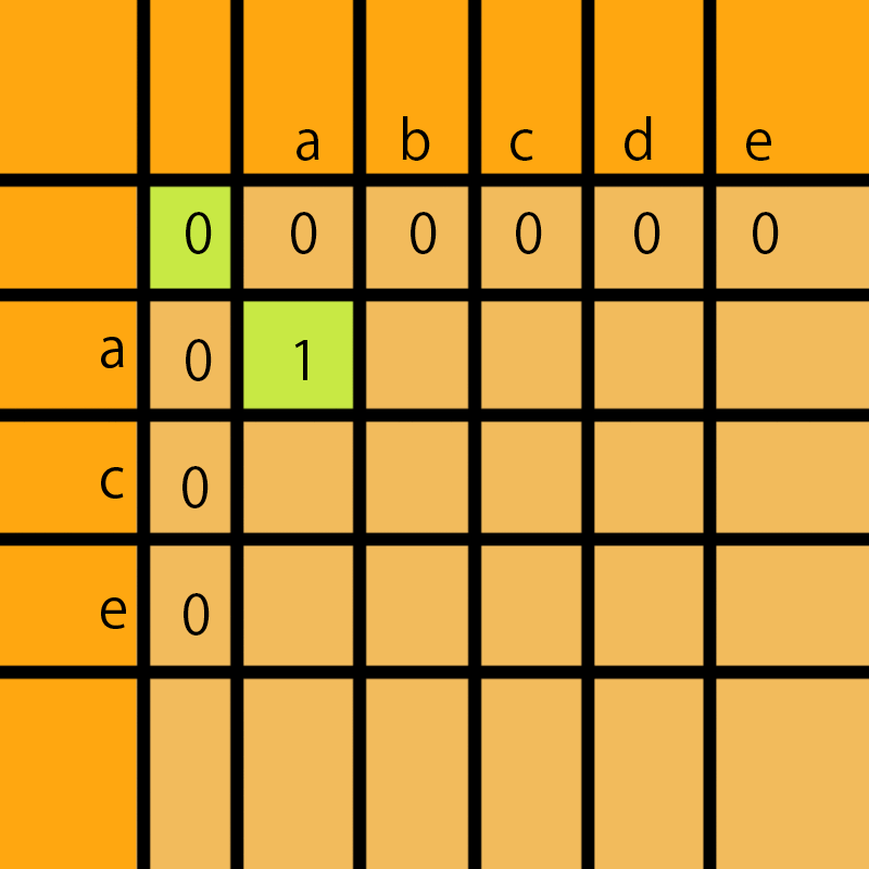 动态规划我们拿笔画一画,一个作为横轴一个作为纵轴,我们以2个字符串为例子,那么abcde作为横轴,ace作为纵轴,先初始化第一行和第一列;因为空字符串无论和 abcdeace比,没有公共的子序列,所以都是0,在一个二维数组里存放的格式dp[[0,0,0,0,0],[0],[0]] a和a比有公共子序列a,那么这里就拿他们前面最优子解加上1,这个0加1等于1,所以这里填1。
