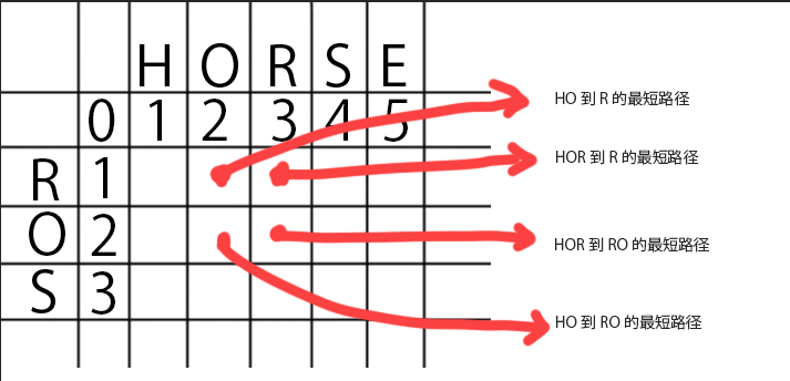 具体来说D[i][j],表示horse前i个字母和ros的前j个字母的编辑距离